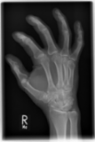 Those who have looked closely will have already recognized the erosion in the head of the third metacarpal bone on the X-ray image. This is shown here only as a faint cysitic lesion without a clear interruption of the cortex. The oblique projection was very helpful here. Unfortunately, these are rarely done anymore.